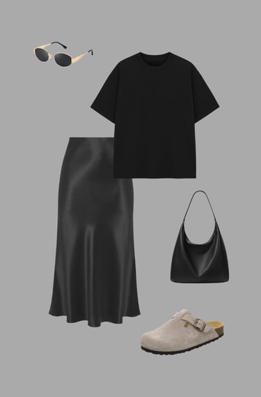 This outfit is a great choice when you want something comfortable yet stylish for spring days. The silky black skirt adds a touch of elegance, while the oversized black T-shirt keeps the look relaxed and modern. Suede clogs and minimal black accessories complete the outfit with an effortless, fashion-forward feel. It’s perfect for coffee dates, casual outings, travel days, or even a laid-back office setting, making it a versatile option you can wear on repeat.